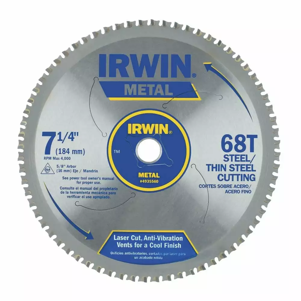 The IRWIN Metal Cutting Circular Saw Blade features laser cut anti-vibration vents for straighter, truer cutting. Constructed with metal-cutting grade carbide teeth for durability, it has anti-kickback tooth shoulders for improved safety, and is ideal for cutting thin metal.