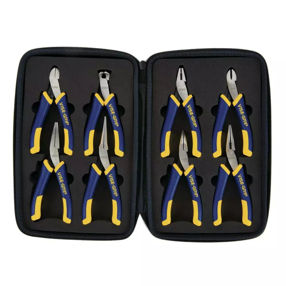 This IRWIN VISE-GRIP Mini 8-piece Pliers Set with Case is made with durable nickel chromium steel and the induction hardened cutting edge will stay sharp, longer. The spring loaded jaw gripping is less tiring and the ProTouch Grips are non-slip, making them comfortable with more control and less hand fatigue. This is a wide variety set VISE-GRIP mini pliers and comes with a convenient storage case. Backed by the IRWIN Lifetime Guarantee.