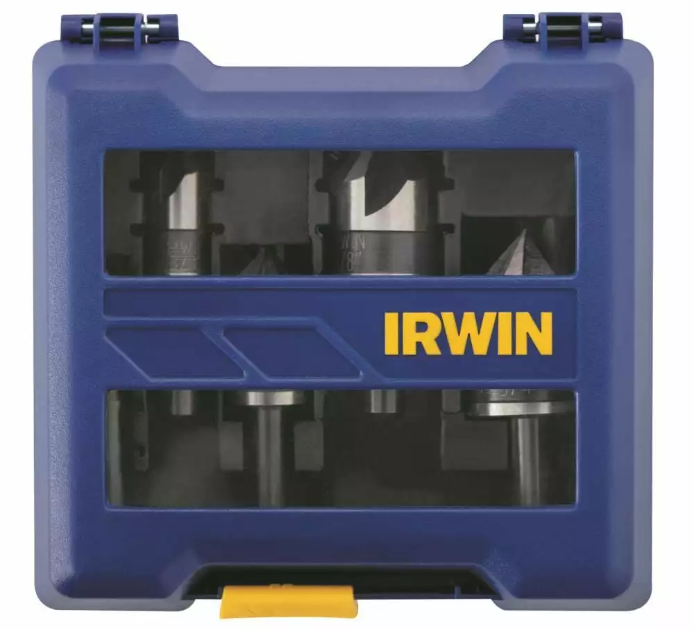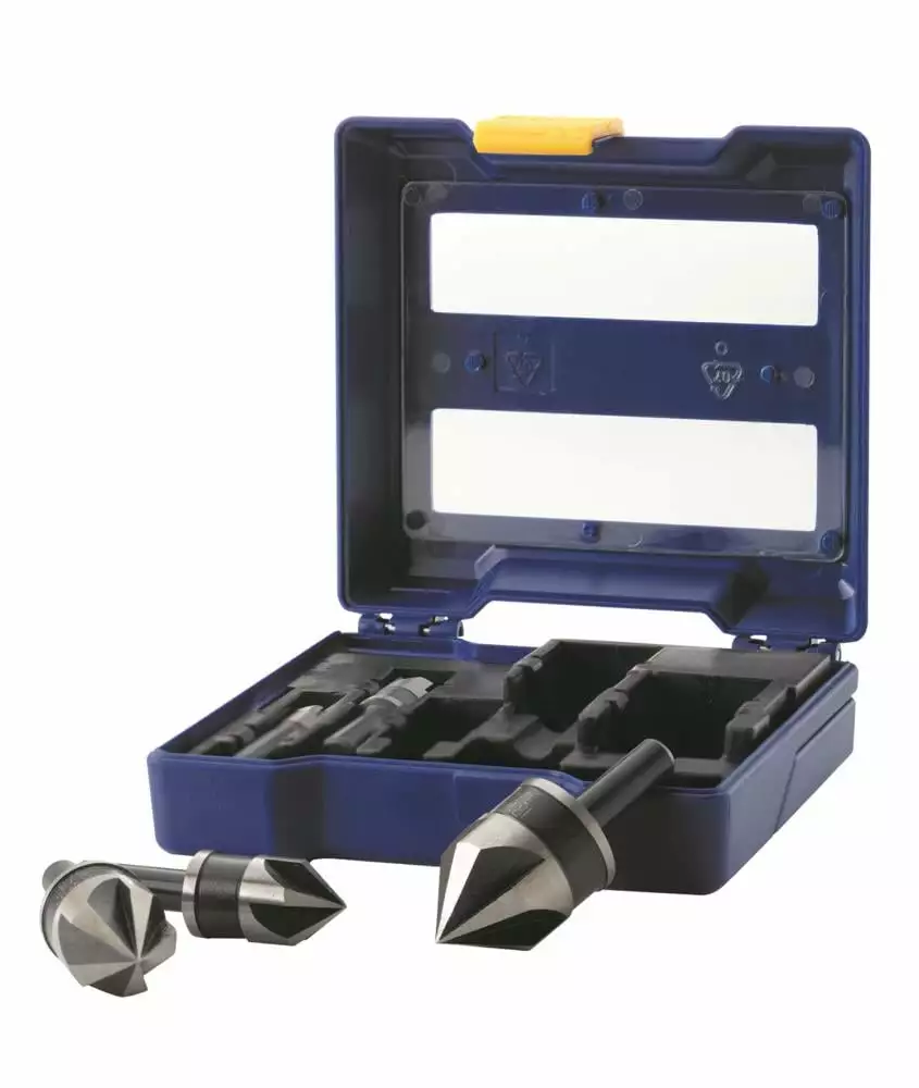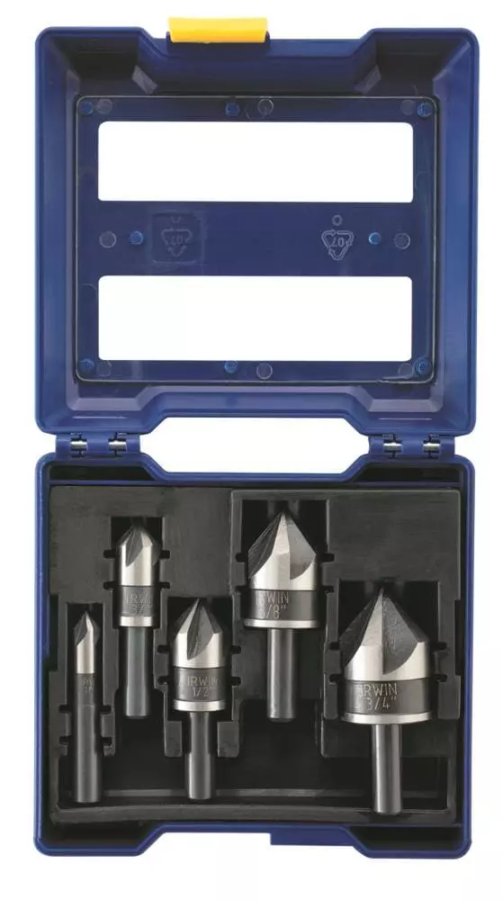 The IRWIN Metal Countersink Drill Bit Set features precision ground 82° tips for countersinking most machinable metals, wood, and plastic. Made from industrial grade high-speed steel for increased durability, each countersink has a black oxide coating to resist corrosion and a five-flute design that reduces vibration for smoother drilling and an extended life. Set includes 1/4-in, 3/8-in, 1/2-in, 5/8-in, and 3/4-in countersinks, and a drawer case.