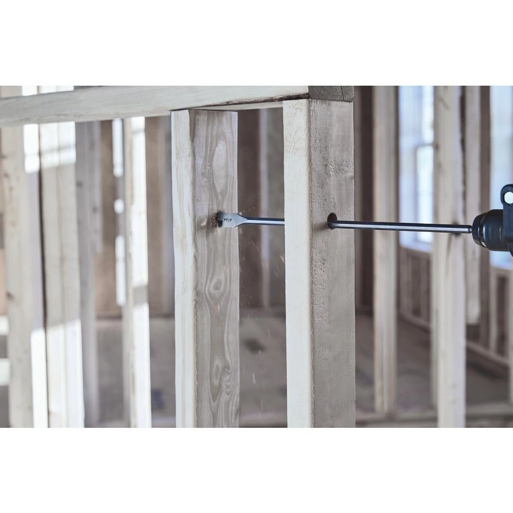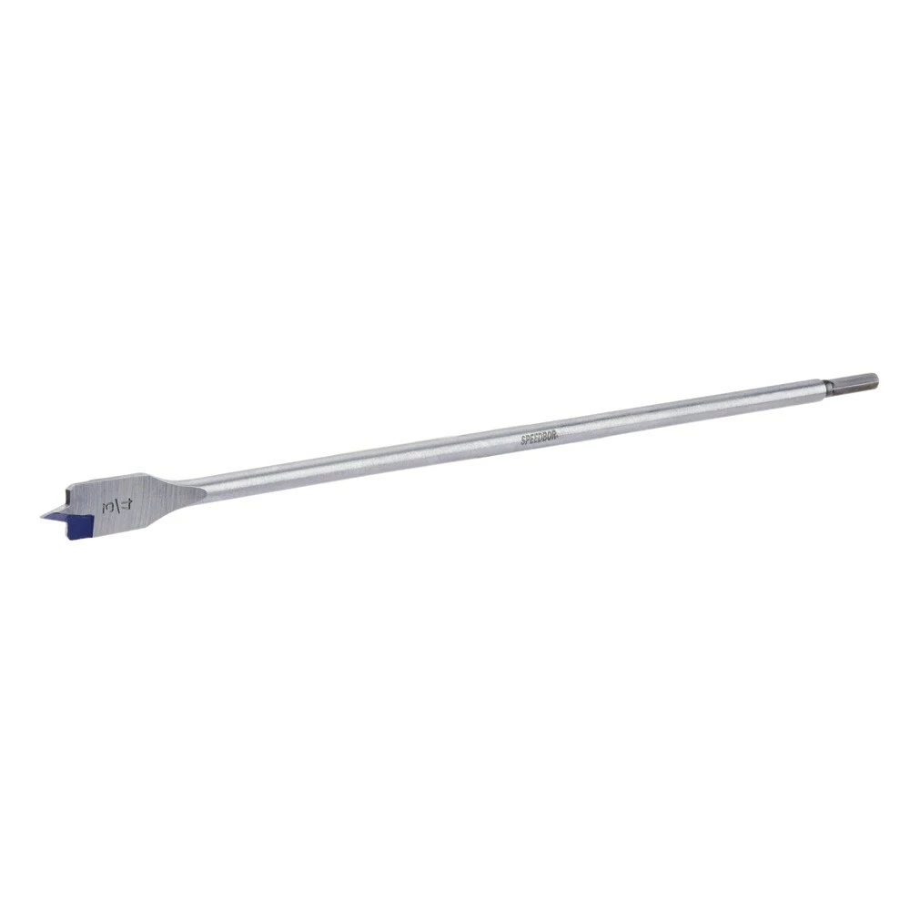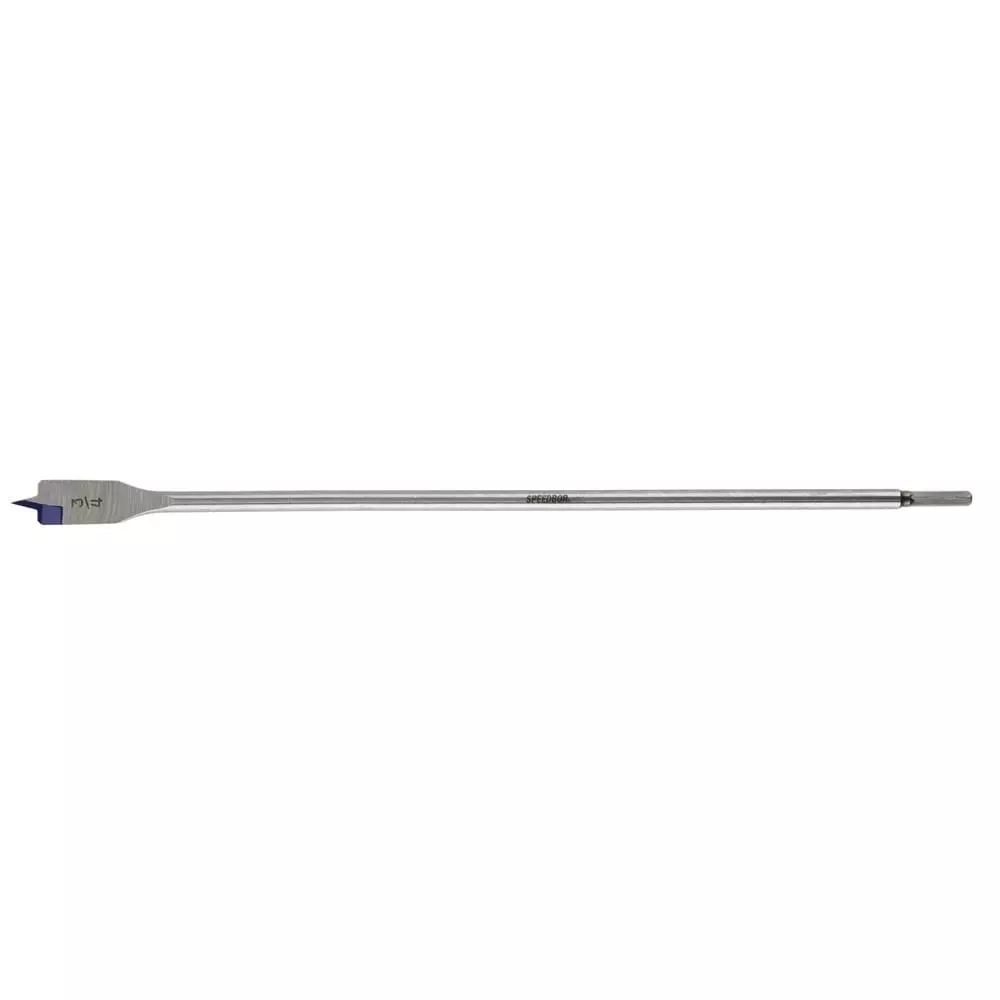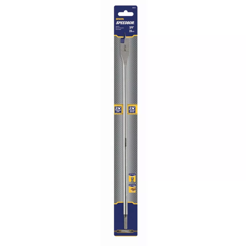 The improved SPEEDBOR Spade Bits now last 2X Longer and cut 2X Faster. Next-generation SPEEDBOR® Spade Bits feature a chamfered cutting edge for durability in cutting wood and optimized point tip that is wider and longer than previous IRWIN spade bits to minimize splintering and control speed. Patented Blue-Groove cutting edge allows for a large cutting area for aggressive removal of wood chips and fast drilling.