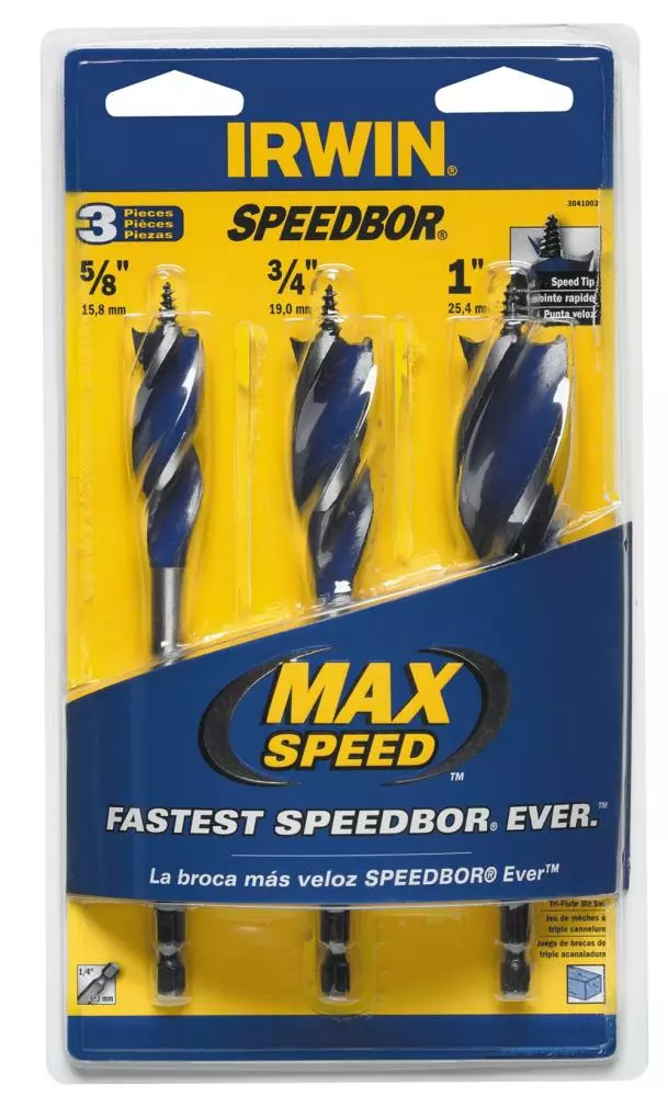 - IRWIN 3-pack Tri-Flute bit set includes 5/8-in SPEEDBOR MAX, 3/4-in SPEEDBOR MAX and 1-in SPEEDBOR MAX, perfect for wood drilling applications